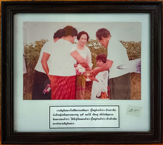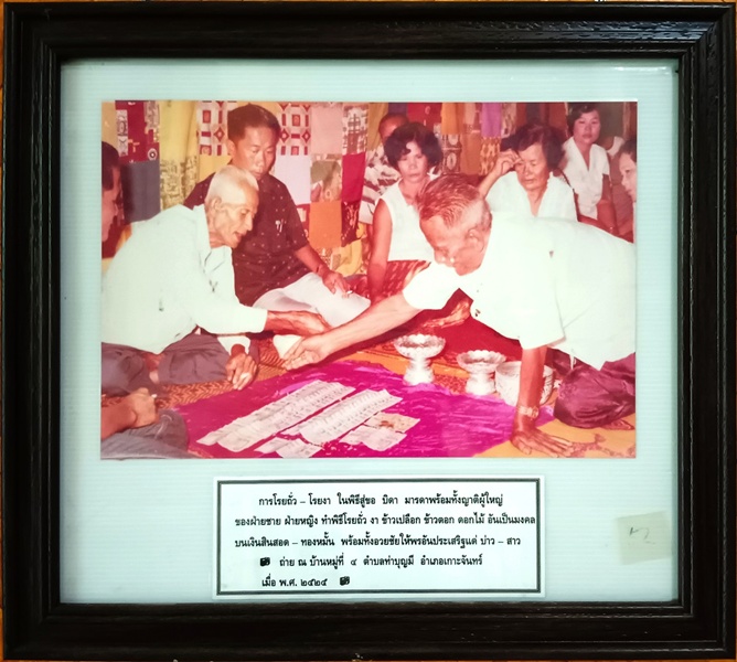 การโรยถั่ว-โรยงา ในพิธีสู่ขอ ข้อมูลจาก: พิพิธภัณฑ์อุทกมรดกท้องถิ่น การโรยถั่ว-โรยงา ในพิธีสู่ขอ มารดาพร้อมทั้งญาติผู้ใหญ่ของฝ่ายชาย ฝ่ายหญิง ทำพิธีโรยข้าวเปลือก ข้าวตอก ดอกไม้ อันเป็นมงคลบนเงินสินสอด-ทองหมั้น พร้อมทั้งอวยชัยให้พรอันประเสริฐแด่ บ่าว-สาว ถ่าย ณ