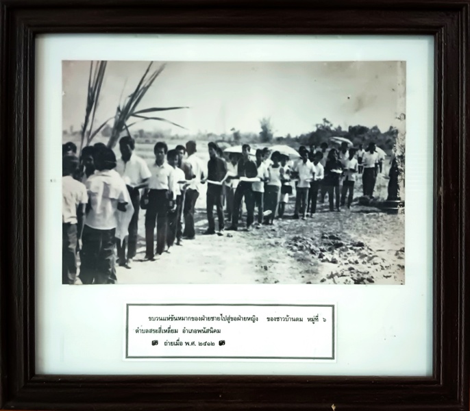 ขบวนแห่ขันหมากของฝ่ายชายไปสู่ขอฝ่ายหญิง ข้อมูลจาก: พิพิธภัณฑ์อุทกมรดกท้องถิ่น ขบวนแห่ขันหมากของฝ่ายชายไปสู่ขอฝ่ายหญิง ของชาวบ้านตม หมู่ที่ ๖ ตำบลสระสี่เหลี่ยม อำเภอพนัสนิคม ถ่ายเมื่อ พ.ศ. ๒๕๑๒ แผนที่