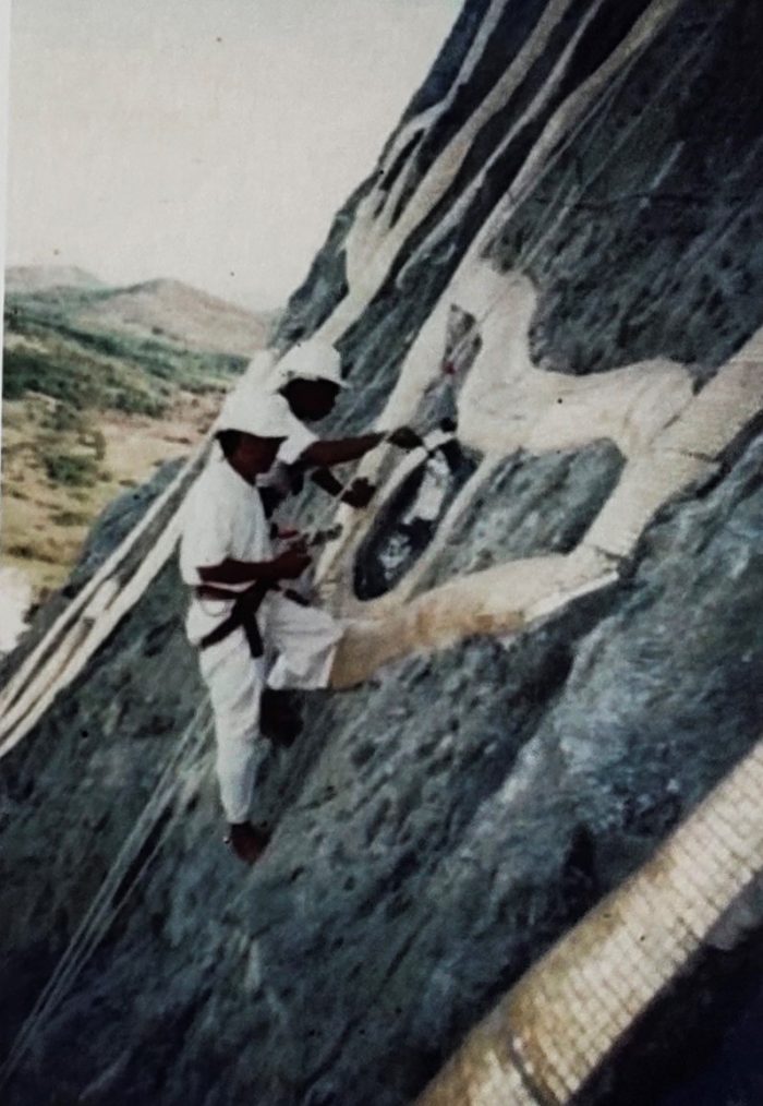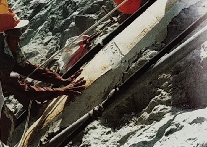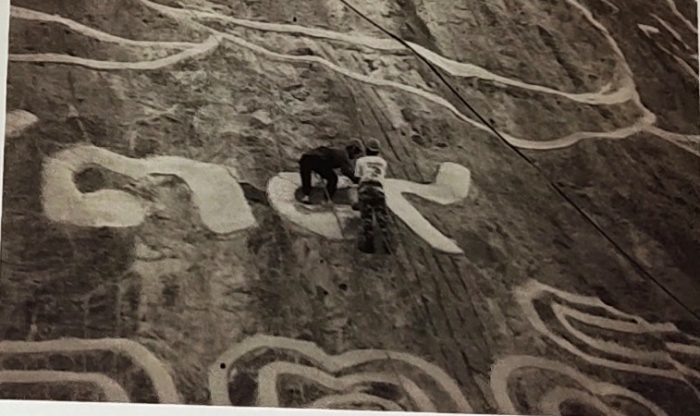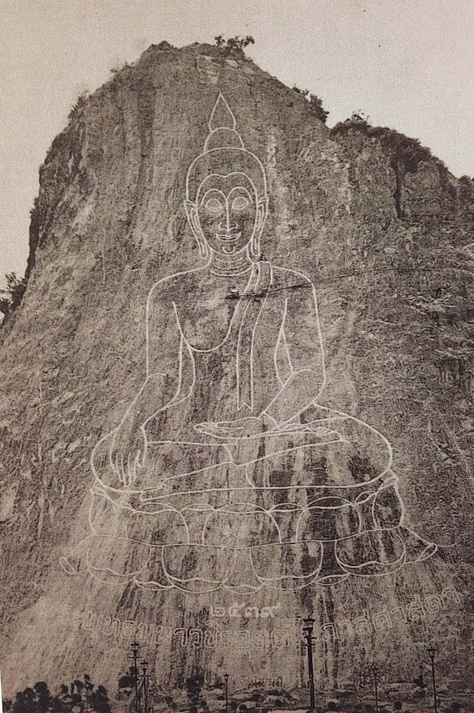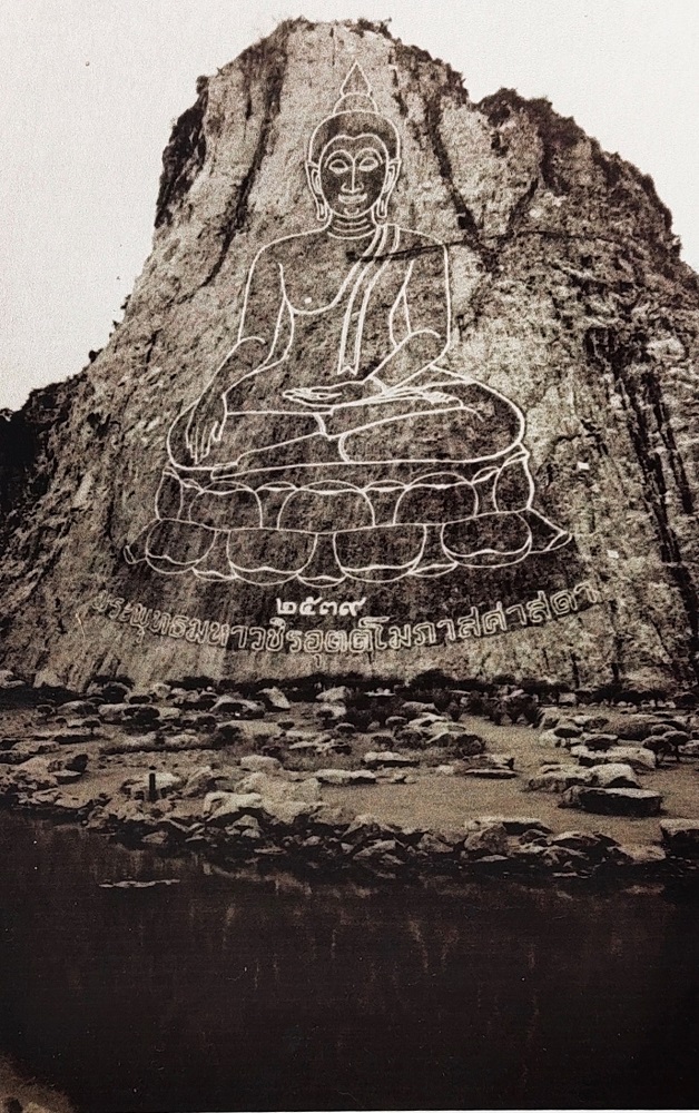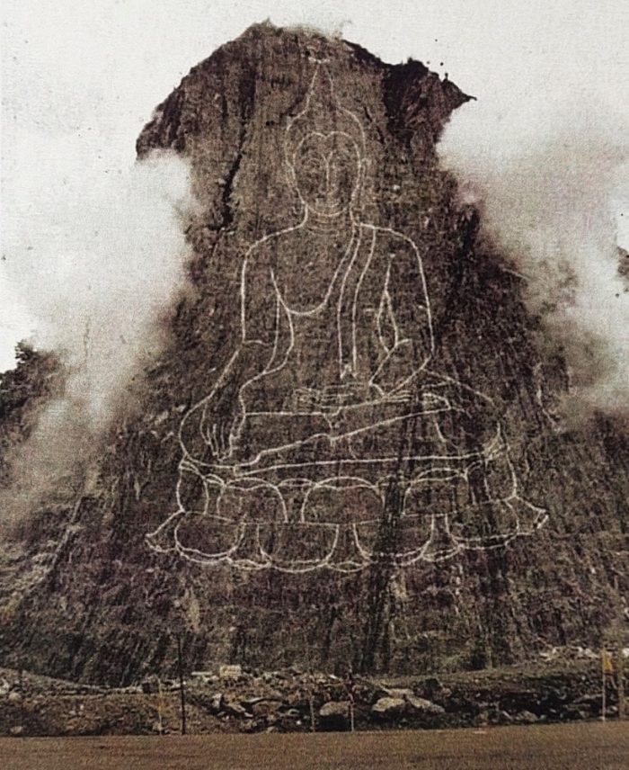 ตรงกลางความหนาของเส้น แล้วจึงระเบิดออกให้เป็นร่องลึกตามต้องการ จากนั้นเป็นการสลักหรืออุดด้วยซีเมนต์ขาวของภาพองค์พระพุทธรูปบนหน้าผา แต่มีปัญหา