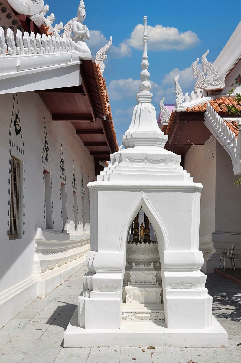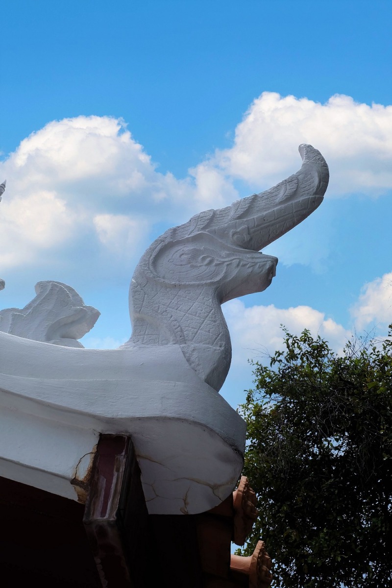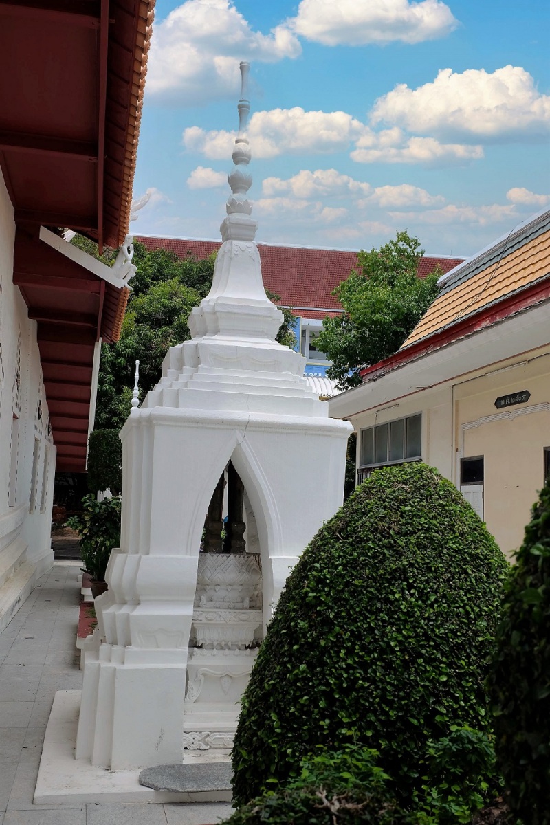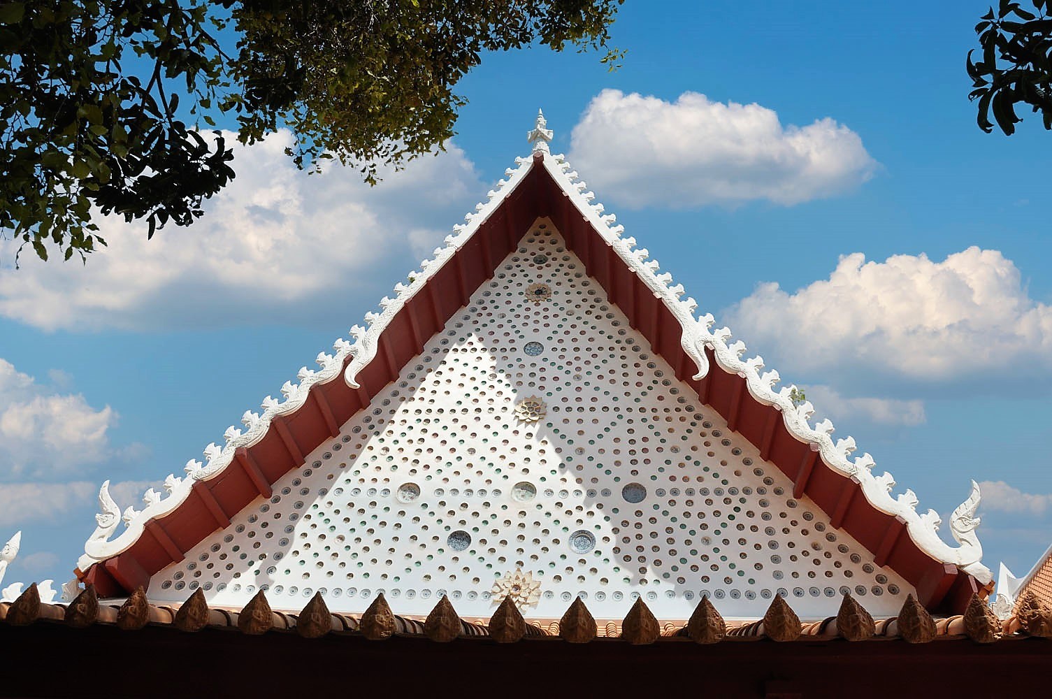 ทิศตะวันออก หลังคาเครื่องไม้มุงกระเบื้องดินเผาสี ลดชั้น ๒ ชั้น มีชายคาปีกนกโดยรอบ เครื่องสยองปูนปั้น ช่อฟ้าทำเป็นรูปเทพพนนหันหน้าออกทั้งสองด้าน