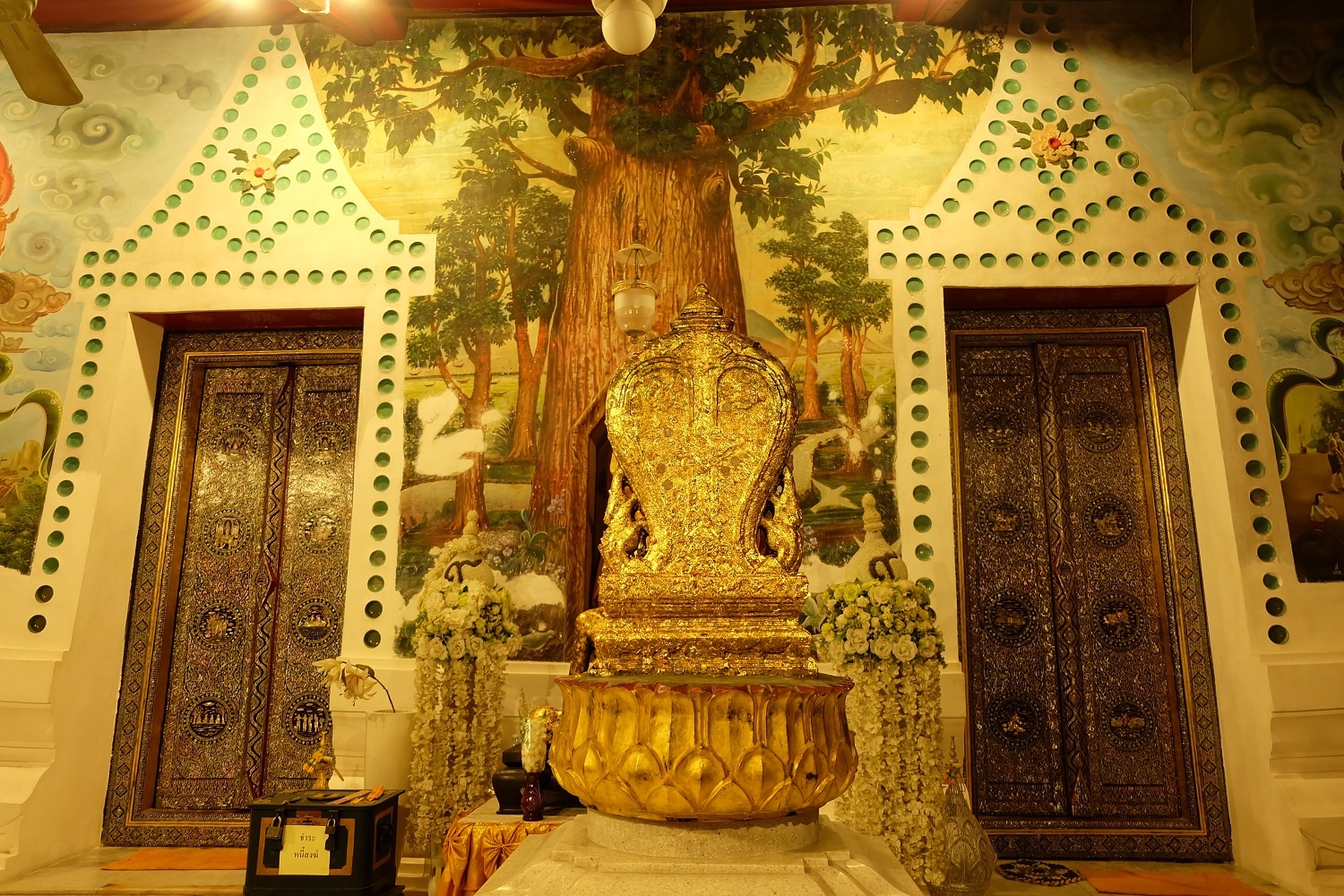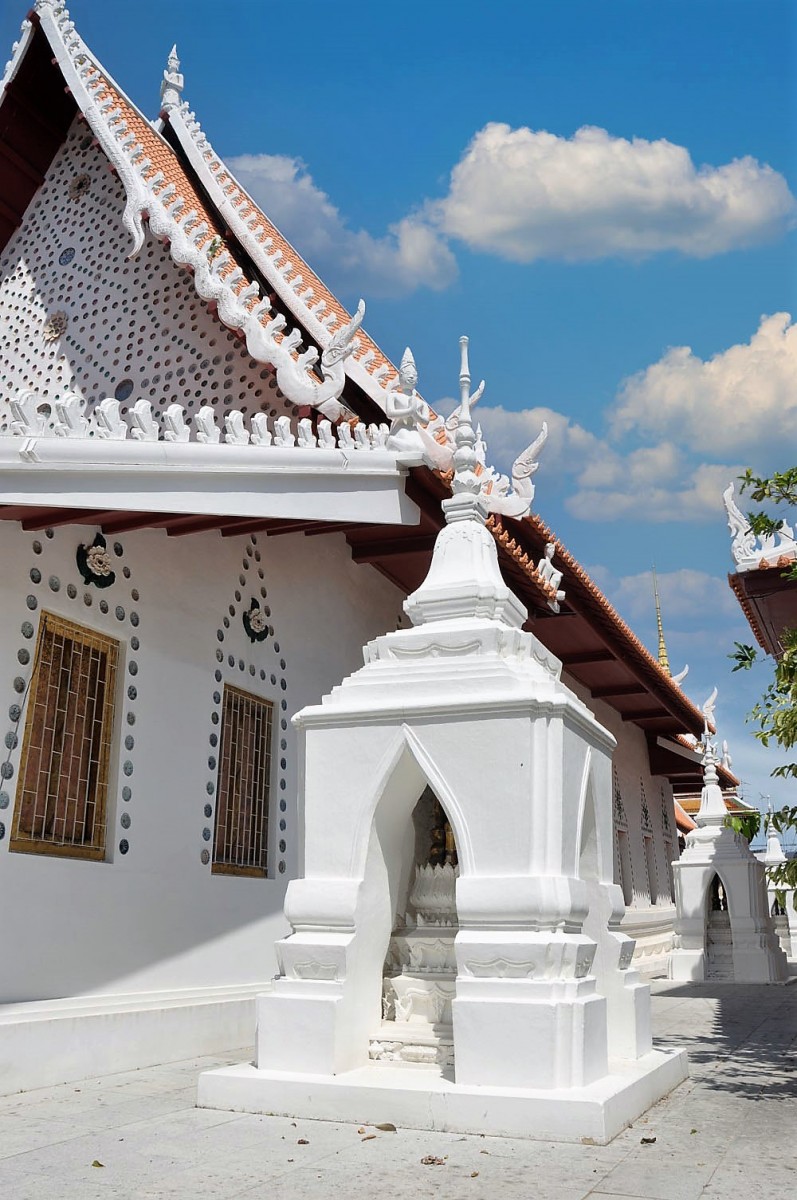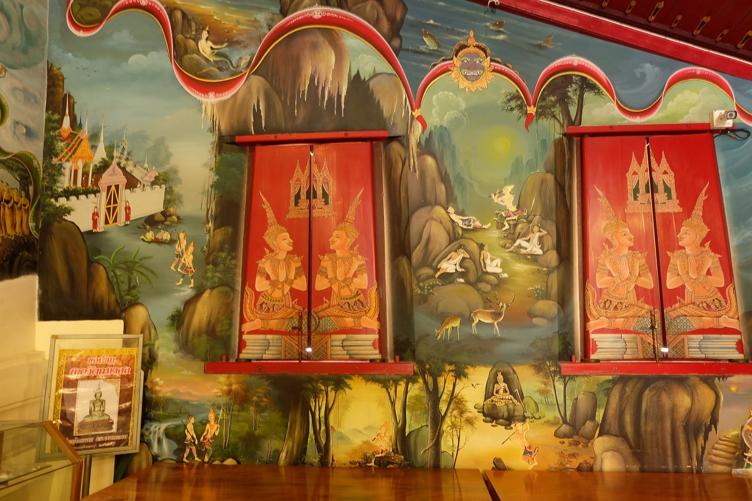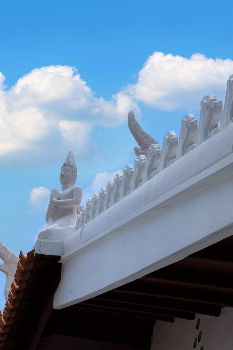 ทิศตะวันออก หลังคาเครื่องไม้มุงกระเบื้องดินเผาสี ลดชั้น ๒ ชั้น มีชายคาปีกนกโดยรอบ เครื่องสยองปูนปั้น ช่อฟ้าทำเป็นรูปเทพพนนหันหน้าออกทั้งสองด้าน