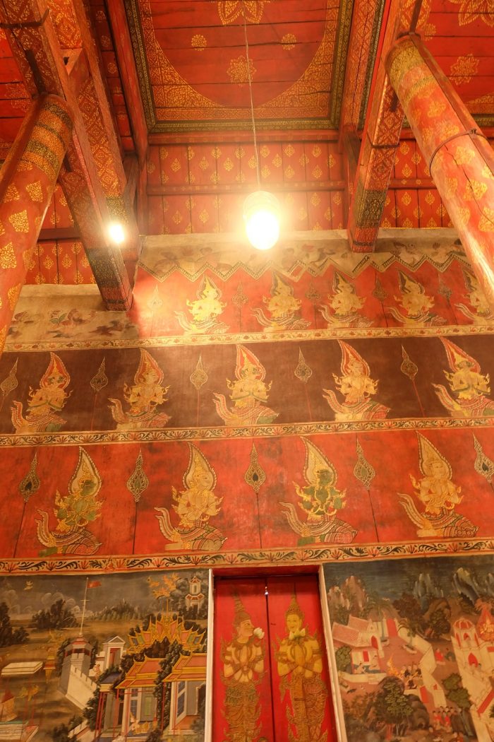 จิตรกรรมฝาผนังในพระอุโบสถ ภาพเทพชุมนุมเรียงกันเป็น ๓ ชั้น : วัดใหญ่อินทาราม