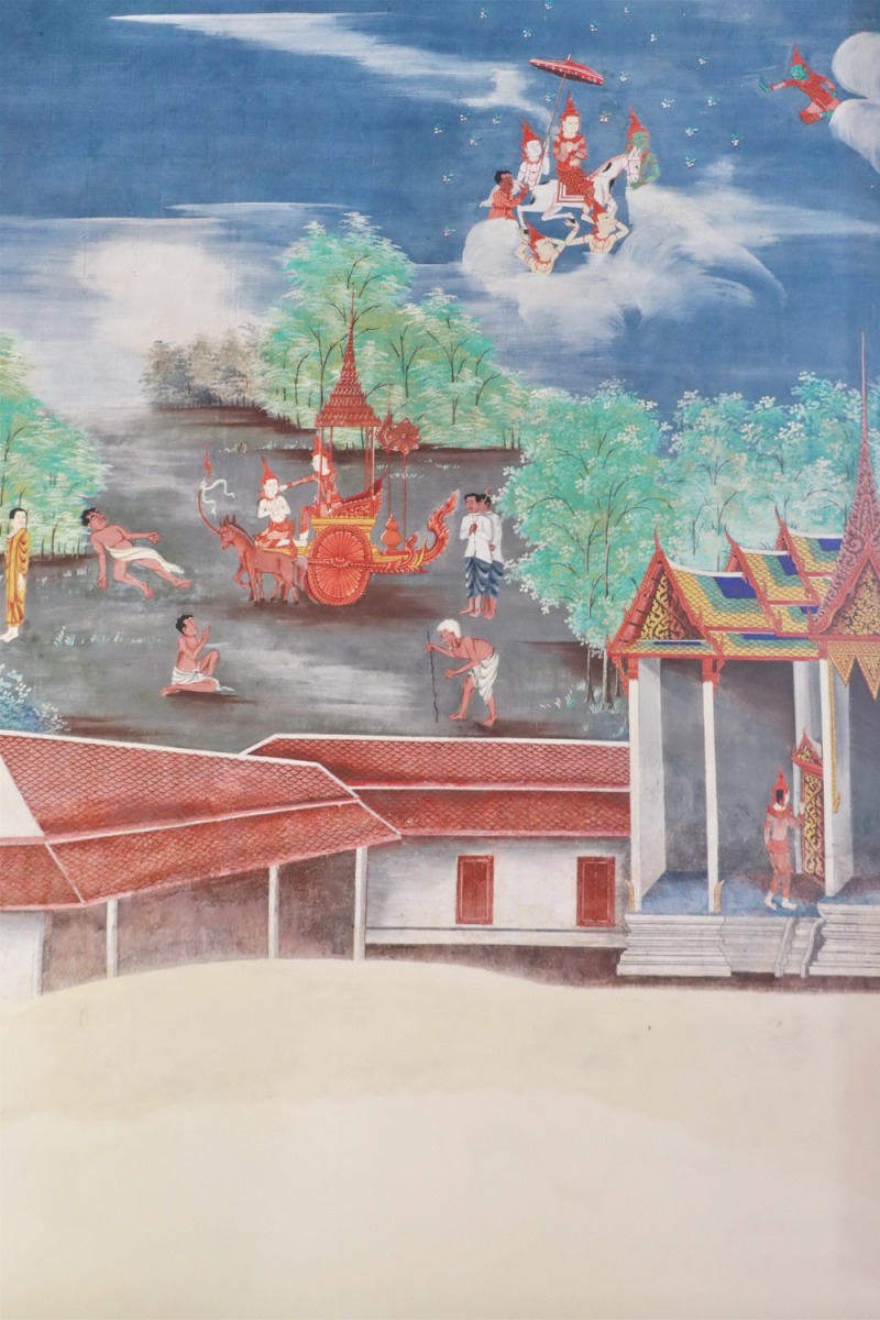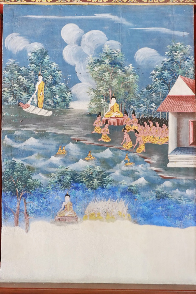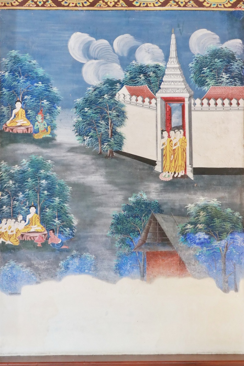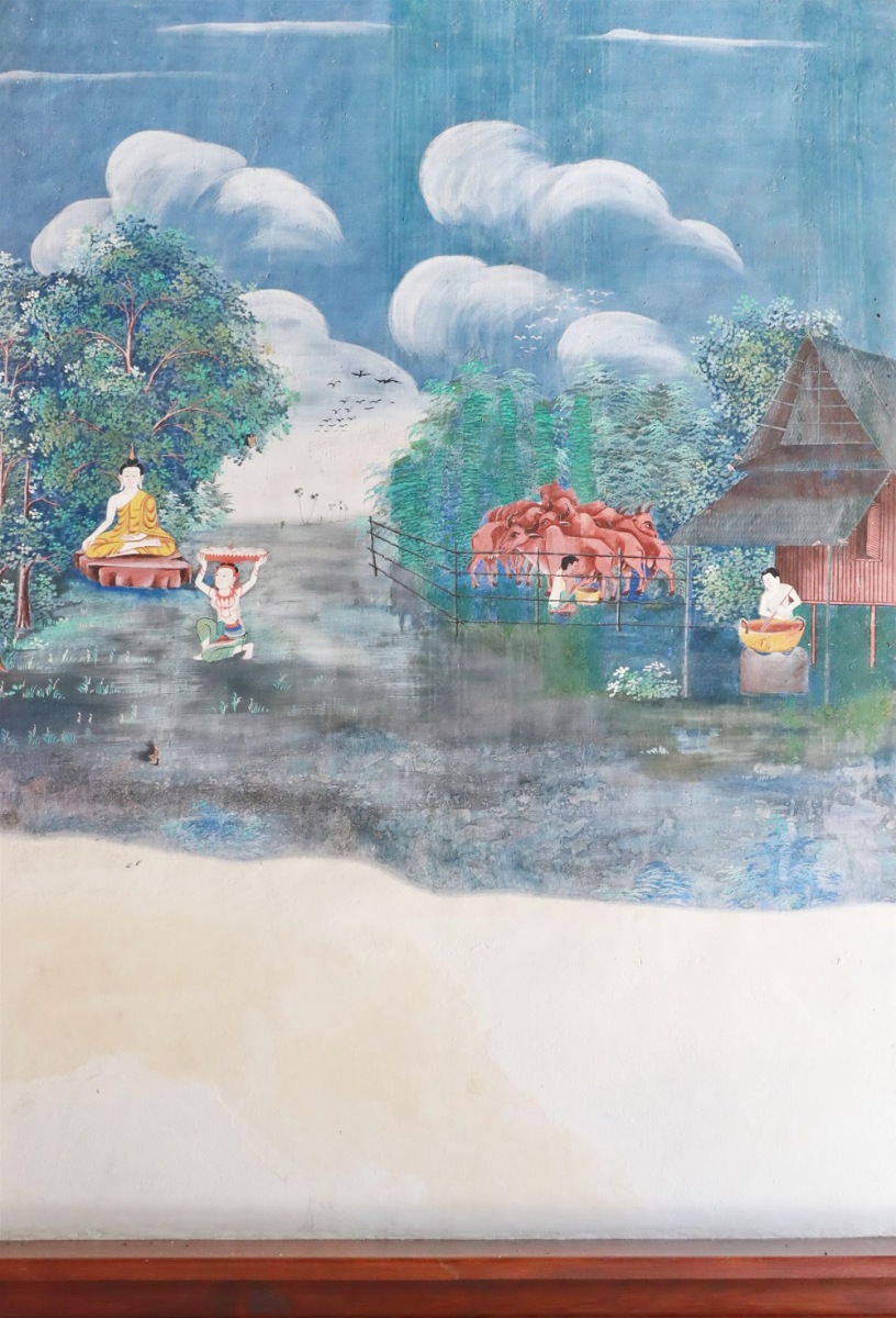 เป็นภาพพุทธประวัติ เริ่มต้นเล่าเรื่องจากผนังทางด้านทิศเหนือตั้งแต่ตอนประสูติจนถึงตอนที่นางตัณหา นางราคาและนางอรที่ ๓ ธิดามารมารำ