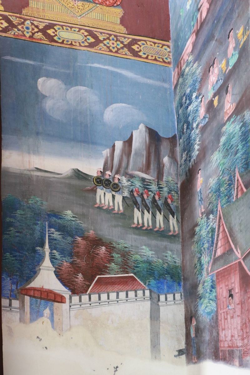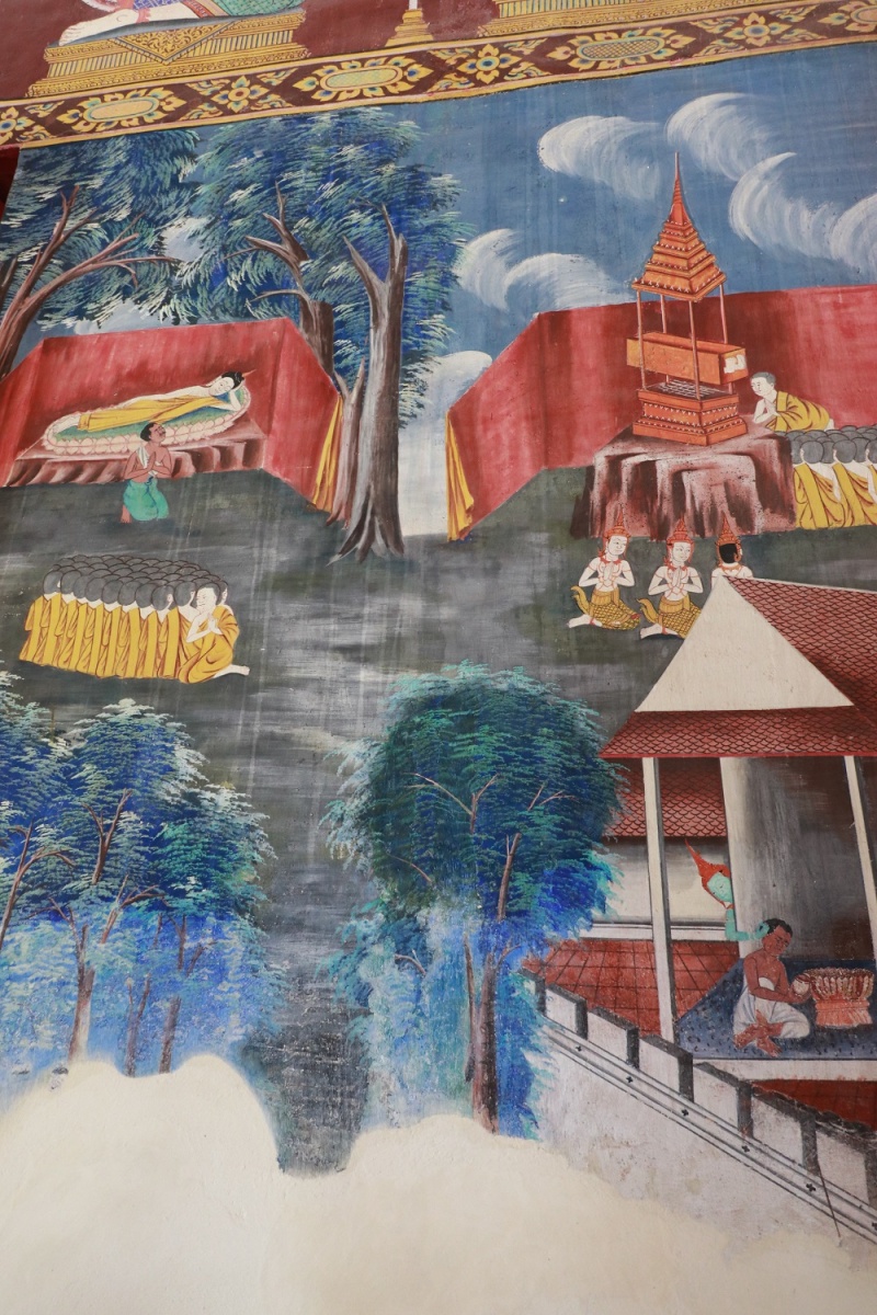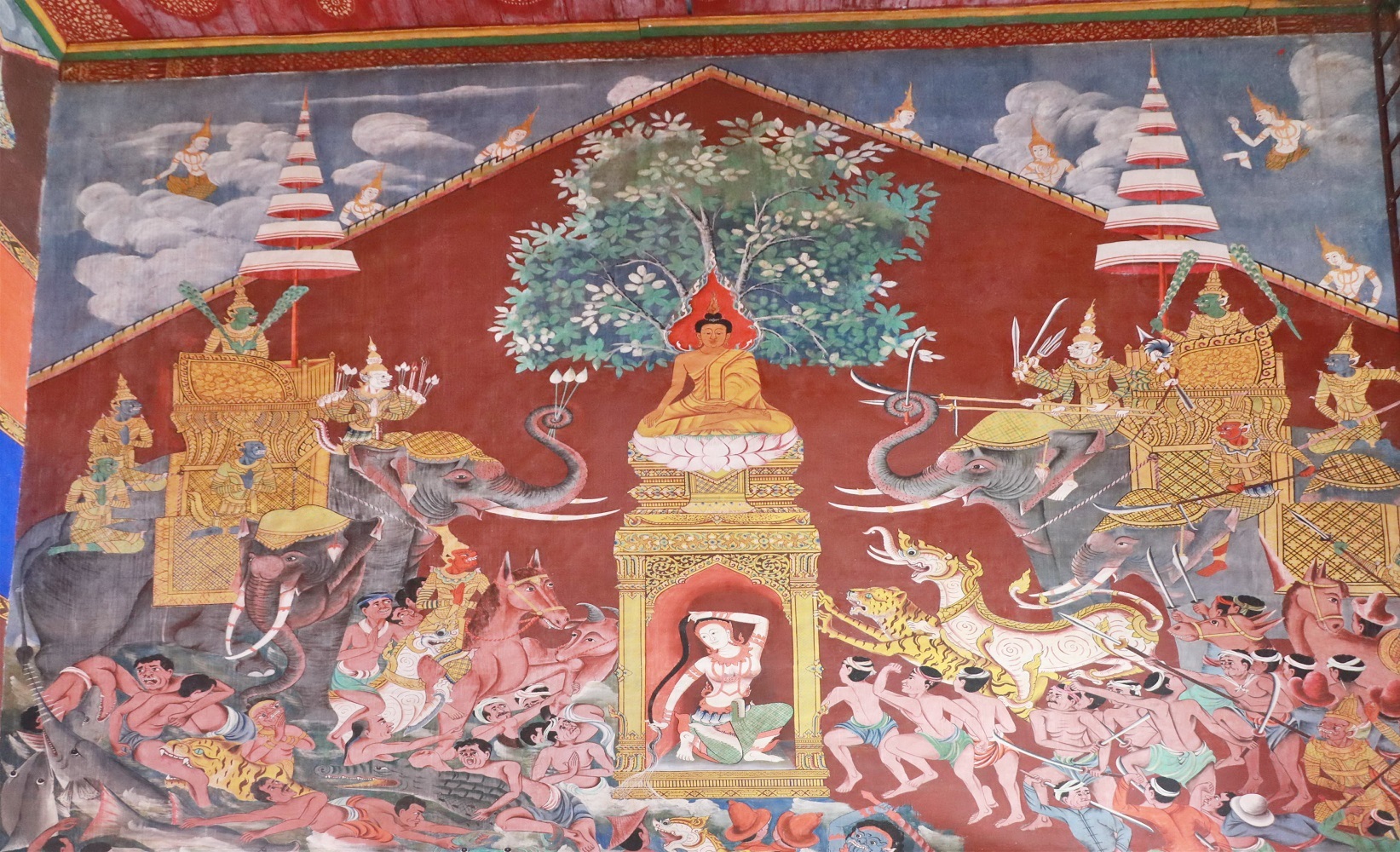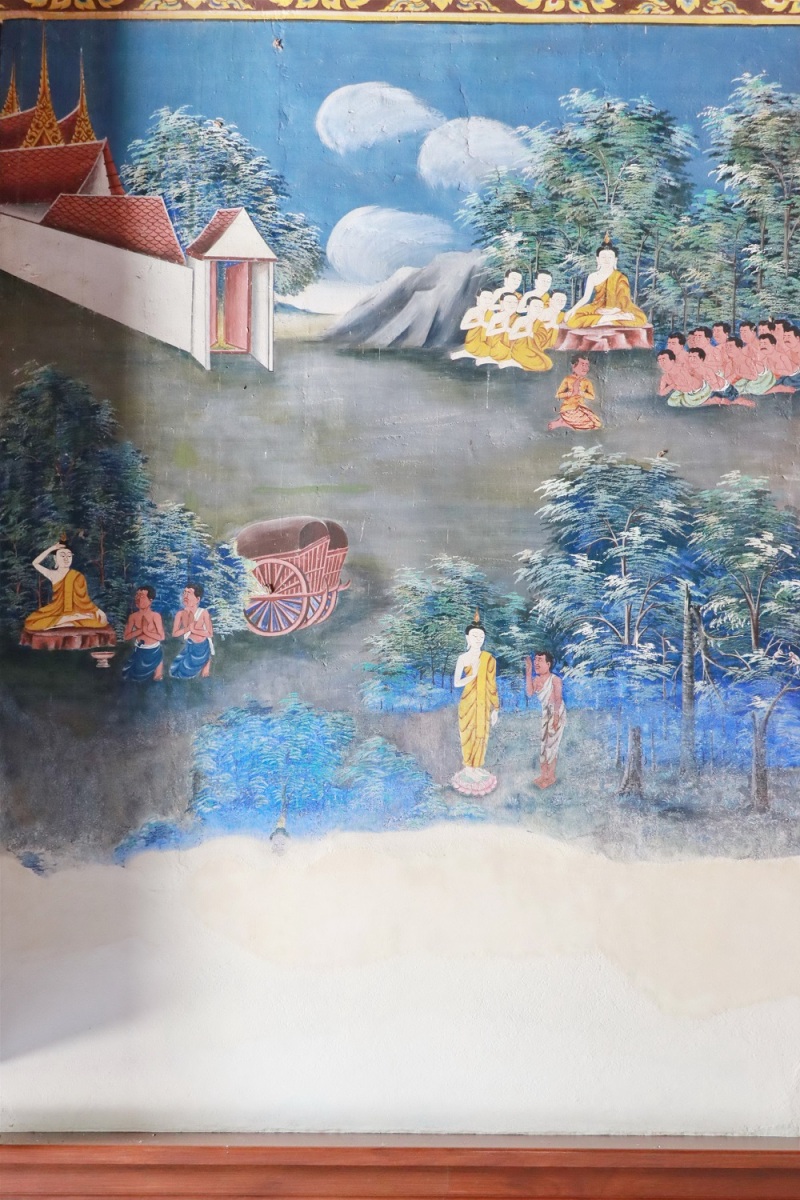เป็นภาพพุทธประวัติ เริ่มต้นเล่าเรื่องจากผนังทางด้านทิศเหนือตั้งแต่ตอนประสูติจนถึงตอนที่นางตัณหา นางราคาและนางอรที่ ๓ ธิดามารมารำ