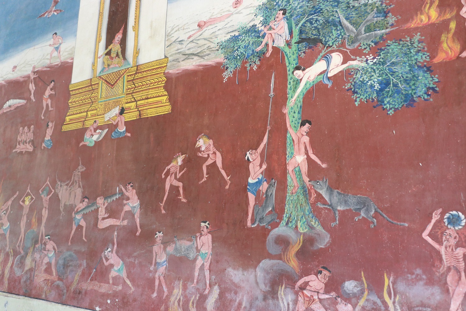 ด้าน ขวาเป็นภาพตอนแสดงยมกปาฏิหาริย์ ส่วนตอนล่างเป็นภาพอบายภูมิ ข้อสังเกตของภาพจิตกรรมฝาผนังวัดใต้ต้นลาน คือ ตอนเสวยวิมุตติสุข