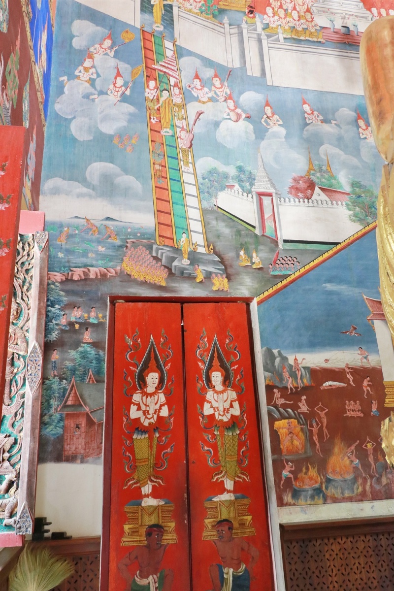 ภาพอุทเทสิกเจดีย์ ด้านซ้ายเป็นภาพเสด็จโปรดพระพุทธมารดาและจำพรรษาบนสวรรค์ชั้นดาวดึงส์ ต่อเนื่องจนถึงตอนเสด็จลงจากสวรรค์ชั้นดาวดึงส์