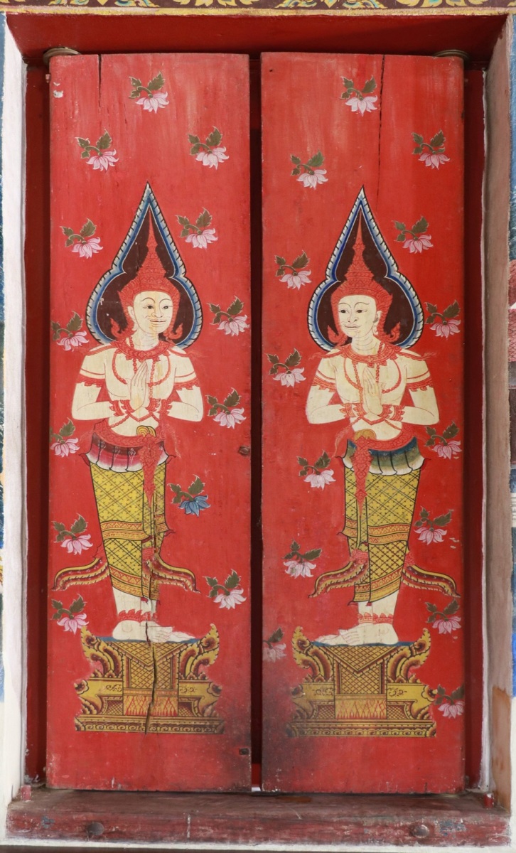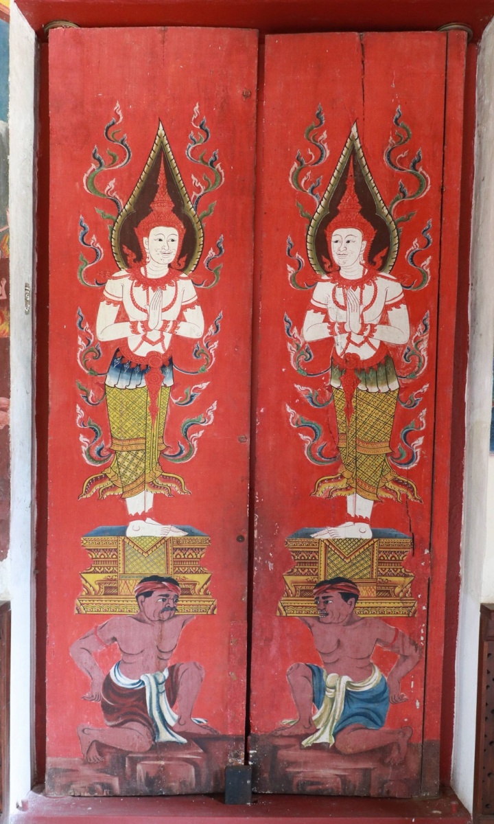 เป็นภาพเทวดาประทับยืนพนมมืออยู่บนแท่นมีรูปบุคคลแบก ลักษณะของภาพลอกเลียนและ ปรับปรุงรูปแบบมาจากภาพทวารบาลของวัดใหญ่สุวรรณาราม จังหวัดเพชรบุรี บานหน้าต่างเป็นรูปเทวดา ประทับยืนพนมมืออยู่บนแท่นมีช่อดอกไม้ร่วงประดับ รอบพระอุโบสถเป็นลานประทักษิณมีกำแพงแก้วก่ออิฐถือปูน