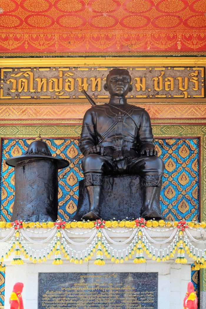 พระบรมราชานุสาวรีย์สมเด็จพระเจ้าตากสินมหาราช สร้างขึ้นเมื่อปี พ.ศ. ๒๕๑๗ เป็นรูปหล่อเต็มพระองค์ในพระอริยาบทประทับนั่ง เมื่อแล้วเสร็จได้อัญเชิญมาประดิษฐานไว้ที่หน้าวัดใหญ่อินทารามวรวิหาร เพื่อเป็นอนุสรณ์และเตือนใจให้อนุชนรุ่นหลังได้ระลึกถึงพระมหากรุณาธิคุณของสมเด็จพระเจ้ากรุงธนบุรีที่ทรงมีต่อชาวชลบุรีและชาวไทย