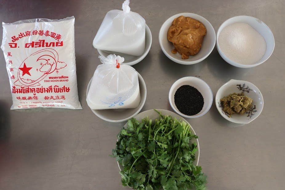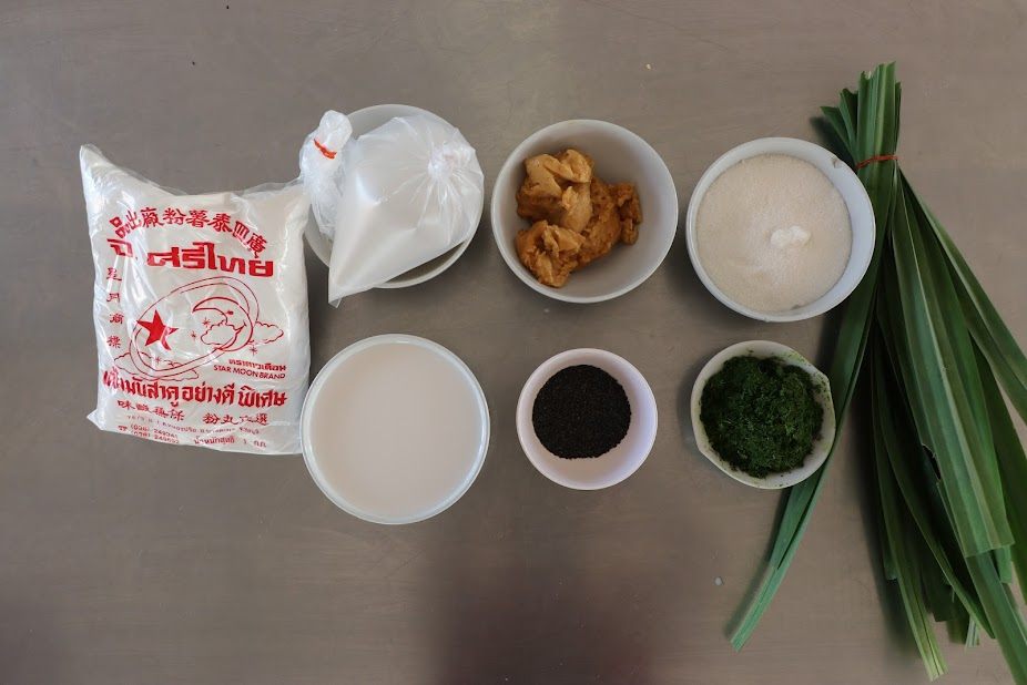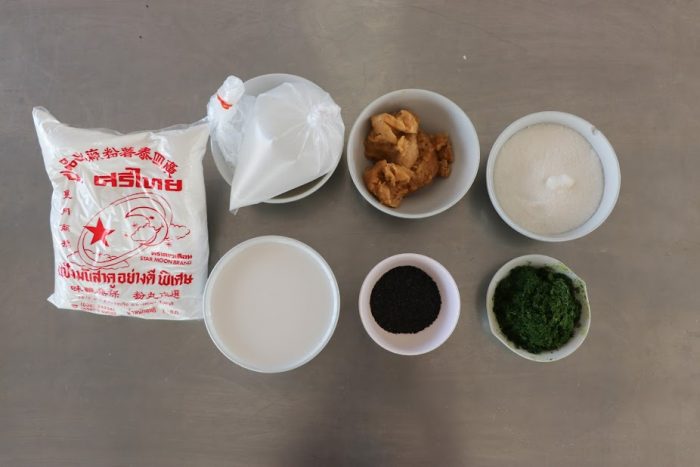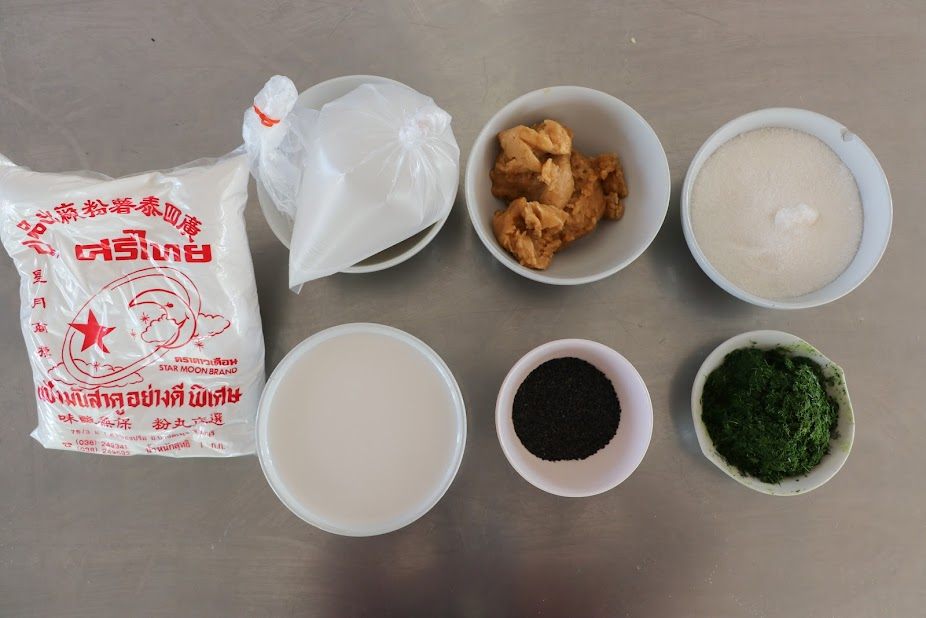 ๔. นำแป้งไปพักไว้ ในอุณหภูมิห้อง อย่างน้อย ๓๐ นาที ถึง ๑ ชั่วโมง จากนั้นใส่งาดำหรือสมุนไพรที่เตรียมไว้ใส่ลงไป คลุกเคล้าให้เข้ากัน
