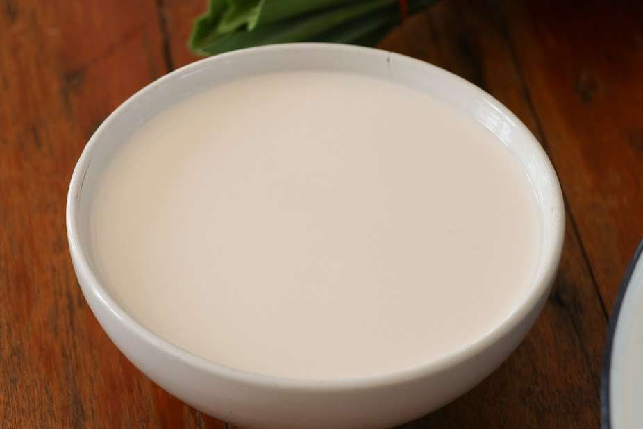 ๓. พอนวดจนน้ำตาลละลายดี และแป้งเนียนเข้าด้วยกัน ค่อย ๆ ใส่หัวกะทิ ลงไปจนหมด นวดให้ทุกอย่างเนียนเข้ากันดี