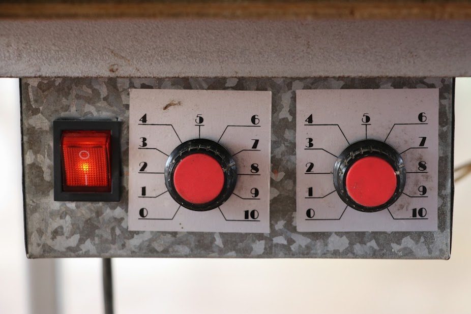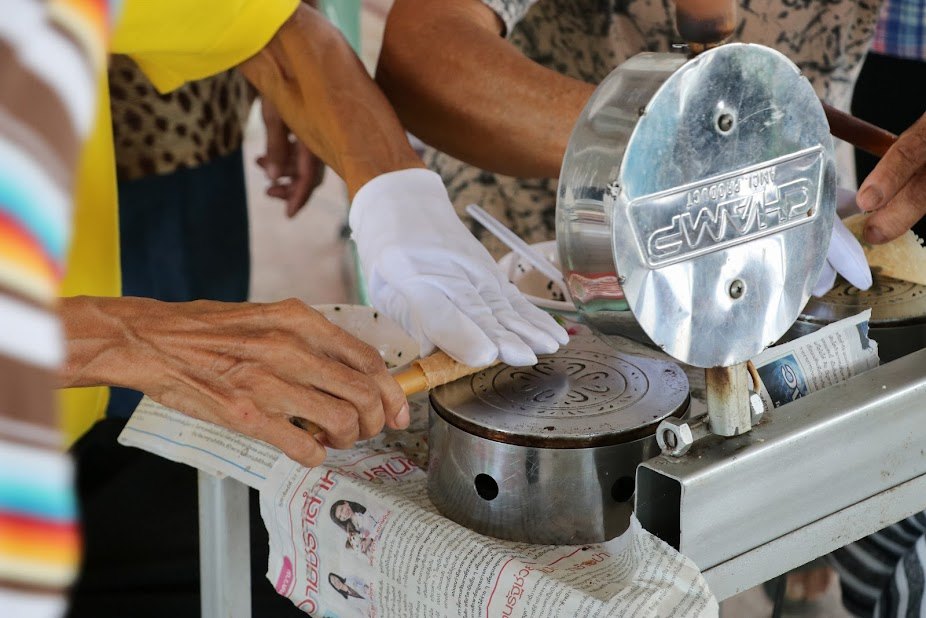 ๕. เตรียมอุปกรณ์สำหรับทำทองม้วน เปิดแก๊สใช้ไฟอ่อน วางพิมพ์ทองม้วนลงไป ทาด้วยน้ำมันพืชบาง ๆ ทั้งด้านบน และด้านล่าง วอร์มให้พิมพ์ร้อน