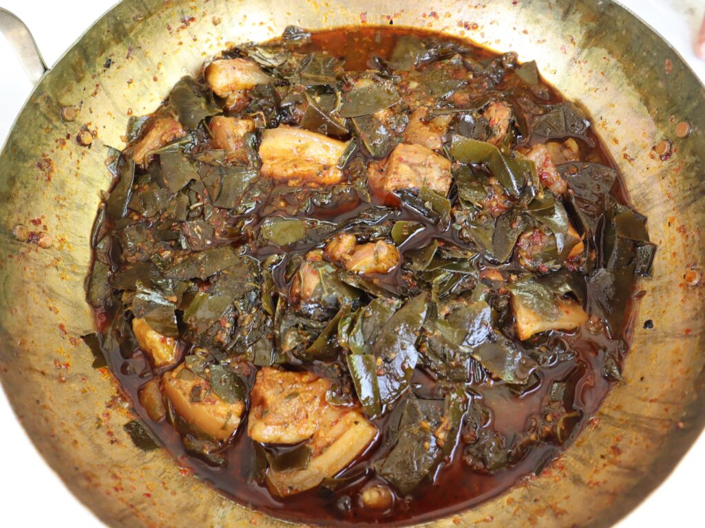 6. ชิมรสชาติต้องมี 3 รส (เปรี้ยว หวาน เค็ม) โดยความเปรี้ยวต้องนำมาจากใบชะมวง (หากยังไม่เปรี้ยวให้เคี่ยวต่ออีกพัก หรือเติมน้ำมะขามเปียกช่วยได้เล็กน้อย)