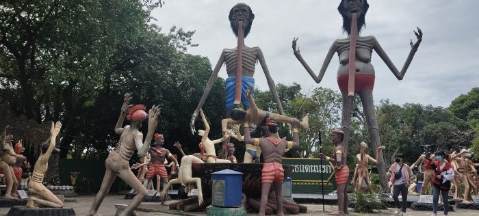 อสูรกายขนาดสูงใหญ่ รูปปั้นแสดงบทลงโทษต่อผู้กระทำชั่ว เมื่อคนทำชั่วตกนรก มีข้อความเตือนสติให้ระลึกถึงการทำความดี