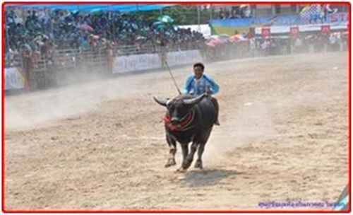 อินทาราม จังหวัดชลบุรี เพื่อนำเครื่องกัณฑ์ใส่ ควายเทียมเกียวนมาพักที่วัด เพื่อจะรอการติดกันเทศน์ในเทศกาล เทศน์มหาชาติ ขณะที่รอเด็กเลี้ยงควายต่างก็นำควายของตนไปอาบ น้ำที่สระบริเวณวัด เมื่อต่างคนต่างพาควายของตนไปก็เกิดมีการประลองฝีเท้าควายเกิดขึ้น เพื่อทดสอบสุขภาพความแข็งแรงกันการแข่งขัน ในระยะแรกๆจึงเป็นเพียงการบังคับควายขณะ วิ่งในระยะที่กำหนด และห้ามตกจากหลังควาย ต่อมาจึงเชื่อว่าการวิ่งควายได้มีการพัฒนา ขึ้นเรื่อยๆ มีการวิ่งรอบตลาด เมื่อถึงเทศกาลก่อนออกพรรษา ๑ วัน ชาวบ้านร้านตลาดต่างก็จะรอดูควายที่มาวิ่งมีการ ตกแต่งควายให้สวย งามและวิจิตรบรรจงมากขึ้นจนกลายเป็นประเพณีวิ่งควาย