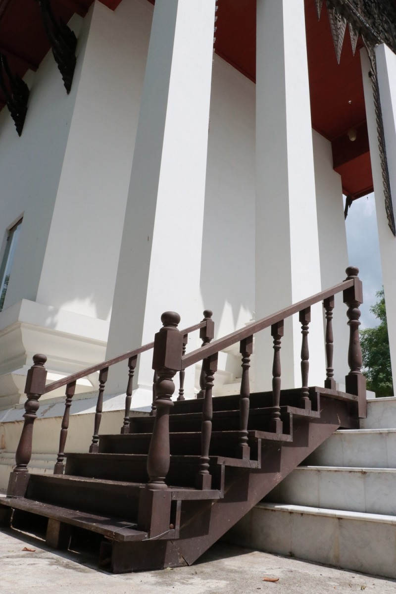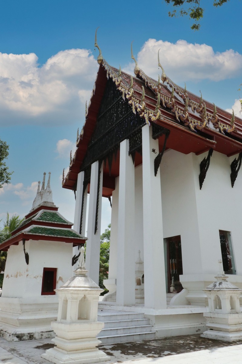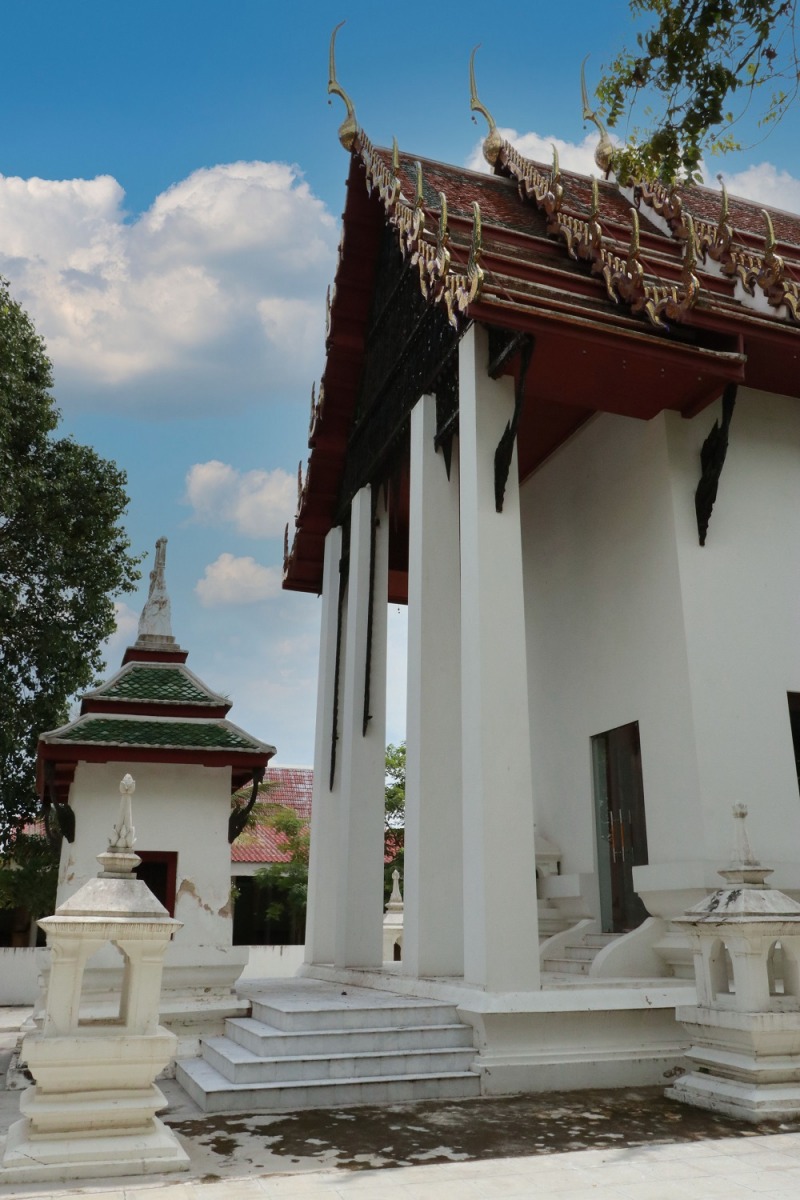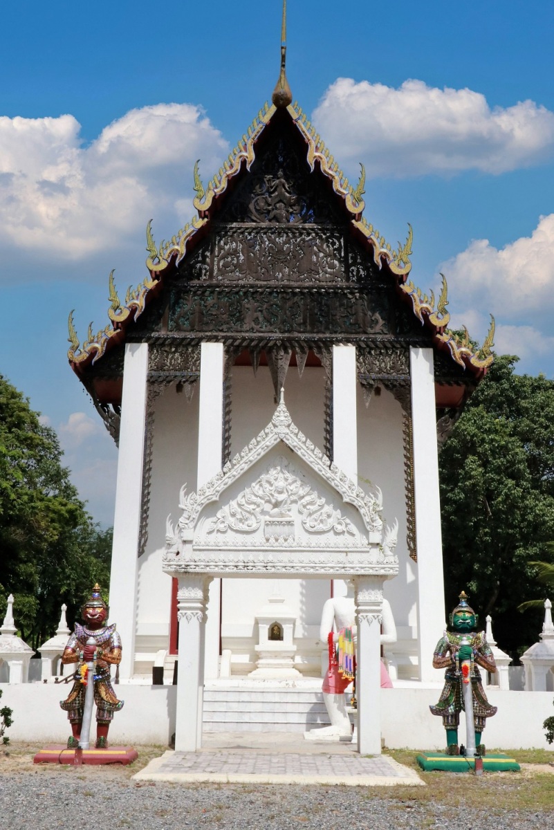 ช่อฟ้า ใบระกาและหางหงส์ปูนปั้นประดับกระจก หน้าบันไม้ประดับกระจกสีมีสาหร่ายรวงผึ้งประดับ ด้านหน้าแบ่งออกเป็น ๓ ช่วง คือ ช่วงบนเป็นไม้ฉลุลายประดับกระจกสีน้ำเงินเป็นรูปพระนารายณ์ ประทับยืนอยู่บนมือของหนุมาน ด้านข้างเป็นดอกไม้และก้านใบไม้คดโค้ง ช่วงกลางของหน้าบันเป็นภาพ ดอกไม้มียักษ์ ๒ ตน ถืออาวุธเหาะอยู่ทางด้านข้างประดับด้วยลายใบไม้ และก้านใบไม้คดโค้ง หน้าบันช่วงล่างเป็นภาพยักษ์ ๔ ตอน มีลายใบไม้และก้านใบไม้คดโค้ง หน้าบันด้านหลังพระอุโบสถมีรูปแบบคล้ายคลึงกัน ช่วงบนเป็นรูปเทวดาประทับนั่งอยู่บนแท่นฐานสิงห์มีชายผ้าทิพย์ห้อยประดับด้วยลายก้านขด ช่วงกลางของหน้าบันเป็นรูปหน้ากาฬ มีเทวดาและนางอัปสรประทับยืนอยู่ทางด้านข้าประดับด้วยลายก้านขด ช่วงล่างเป็นรูปเทวดา นางอัปสร และยักษ์นั่งพนมมือแสดงความเคารพ ด้านข้างมีลายก้านขดประดับ