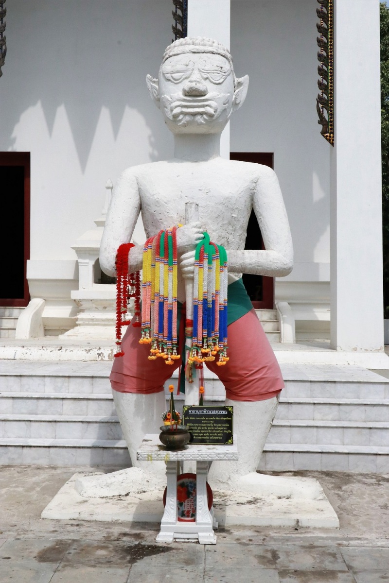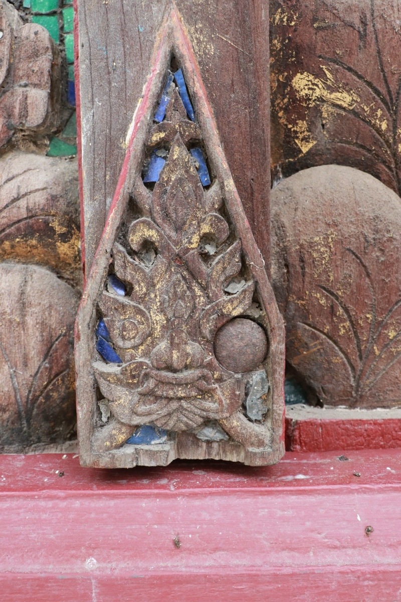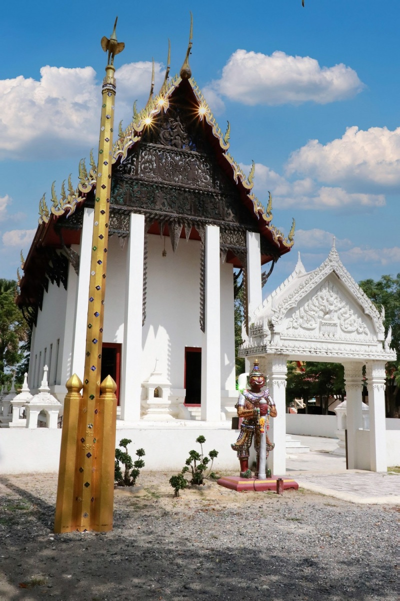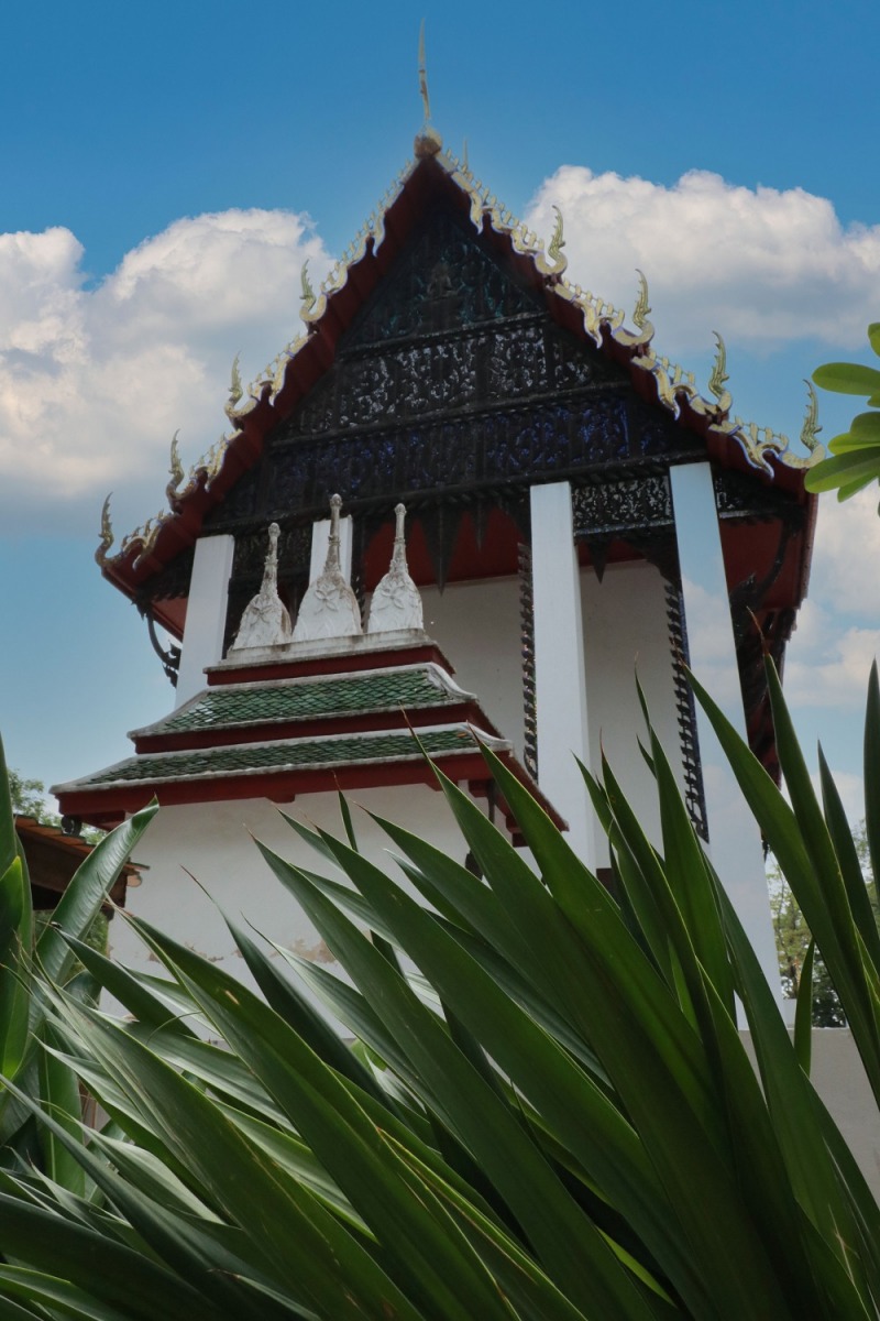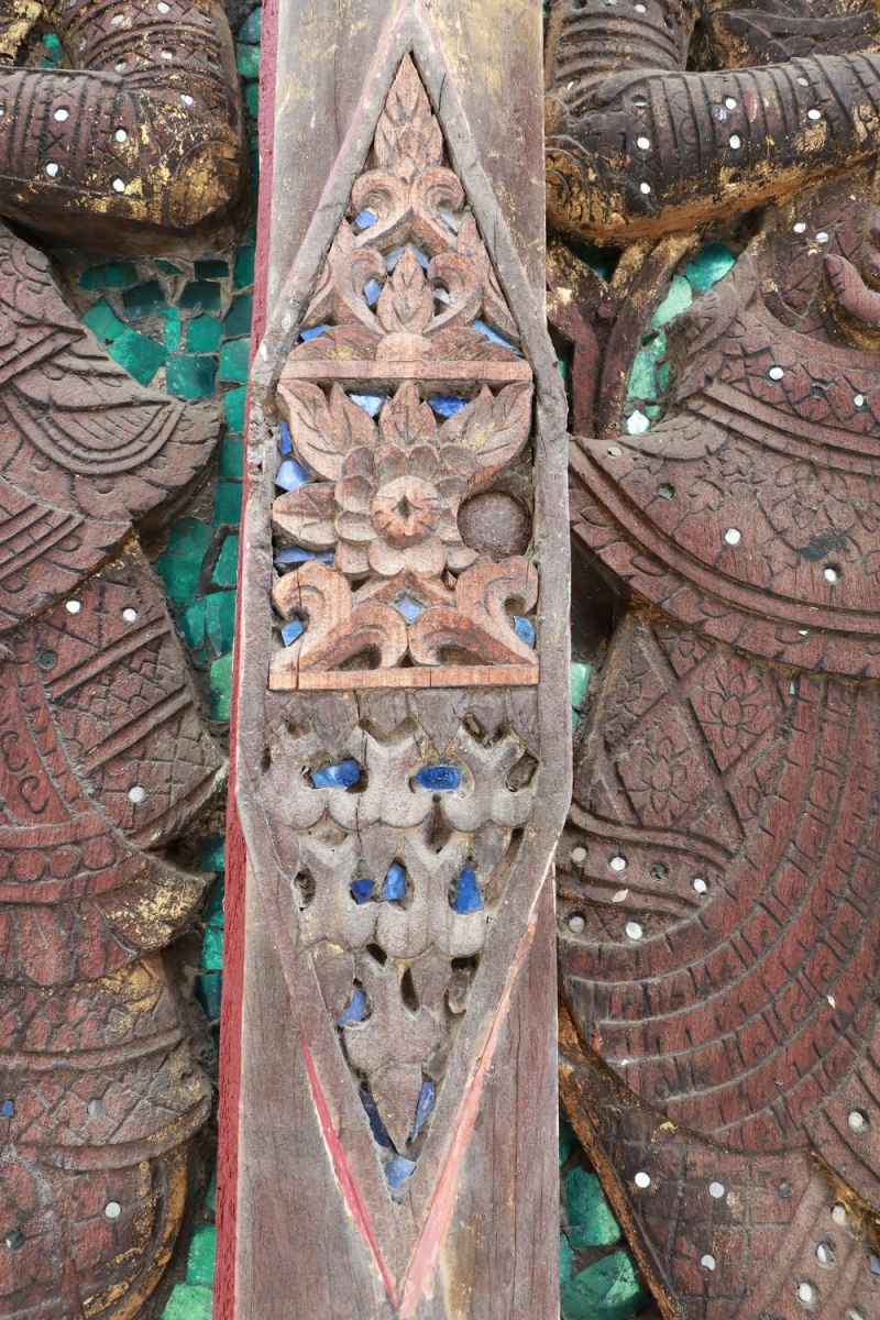 ช่อฟ้า ใบระกาและหางหงส์ปูนปั้นประดับกระจก หน้าบันไม้ประดับกระจกสีมีสาหร่ายรวงผึ้งประดับ ด้านหน้าแบ่งออกเป็น ๓ ช่วง คือ ช่วงบนเป็นไม้ฉลุลายประดับกระจกสีน้ำเงินเป็นรูปพระนารายณ์ ประทับยืนอยู่บนมือของหนุมาน ด้านข้างเป็นดอกไม้และก้านใบไม้คดโค้ง ช่วงกลางของหน้าบันเป็นภาพ ดอกไม้มียักษ์ ๒ ตน ถืออาวุธเหาะอยู่ทางด้านข้างประดับด้วยลายใบไม้ และก้านใบไม้คดโค้ง หน้าบันช่วงล่างเป็นภาพยักษ์ ๔ ตอน มีลายใบไม้และก้านใบไม้คดโค้ง หน้าบันด้านหลังพระอุโบสถมีรูปแบบคล้ายคลึงกัน ช่วงบนเป็นรูปเทวดาประทับนั่งอยู่บนแท่นฐานสิงห์มีชายผ้าทิพย์ห้อยประดับด้วยลายก้านขด ช่วงกลางของหน้าบันเป็นรูปหน้ากาฬ มีเทวดาและนางอัปสรประทับยืนอยู่ทางด้านข้าประดับด้วยลายก้านขด ช่วงล่างเป็นรูปเทวดา นางอัปสร และยักษ์นั่งพนมมือแสดงความเคารพ ด้านข้างมีลายก้านขดประดับ