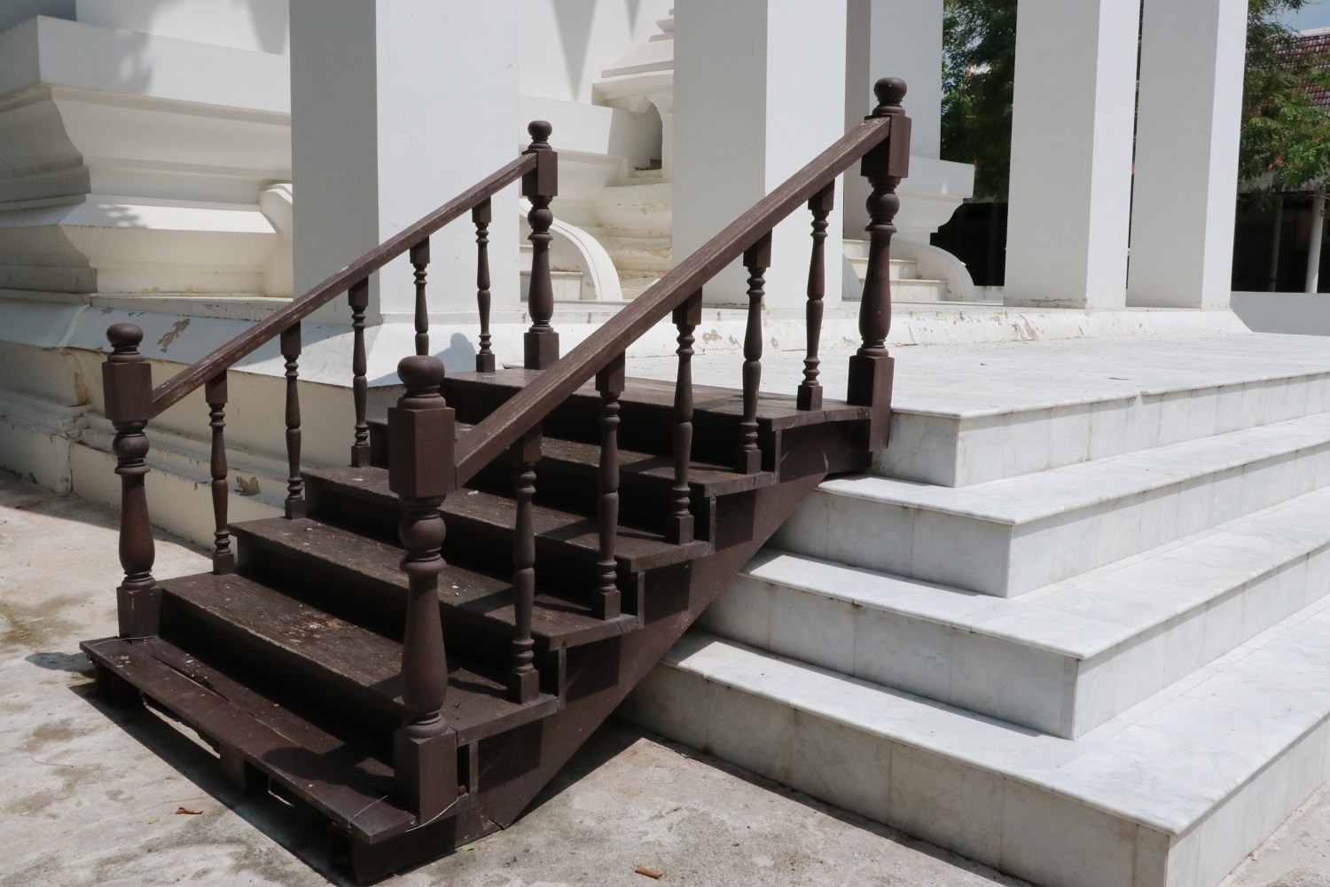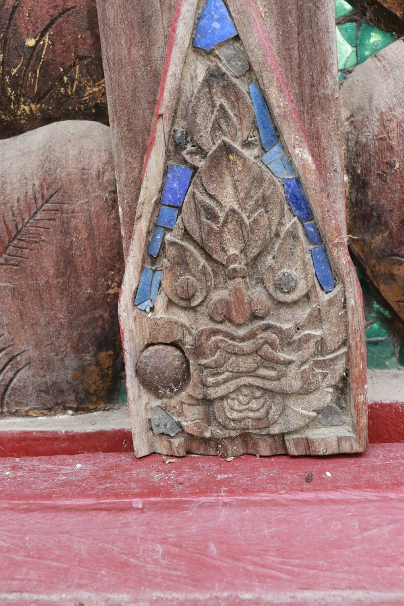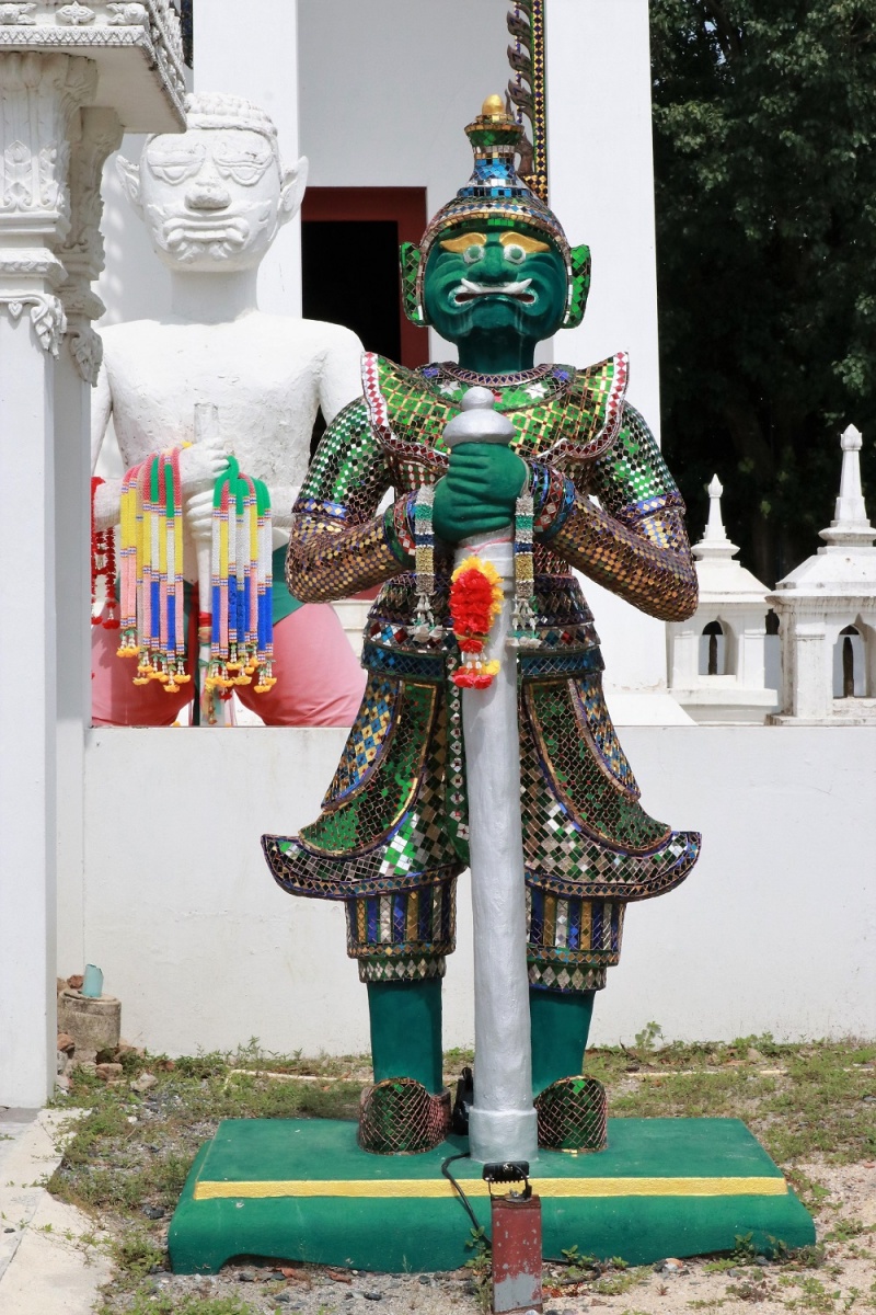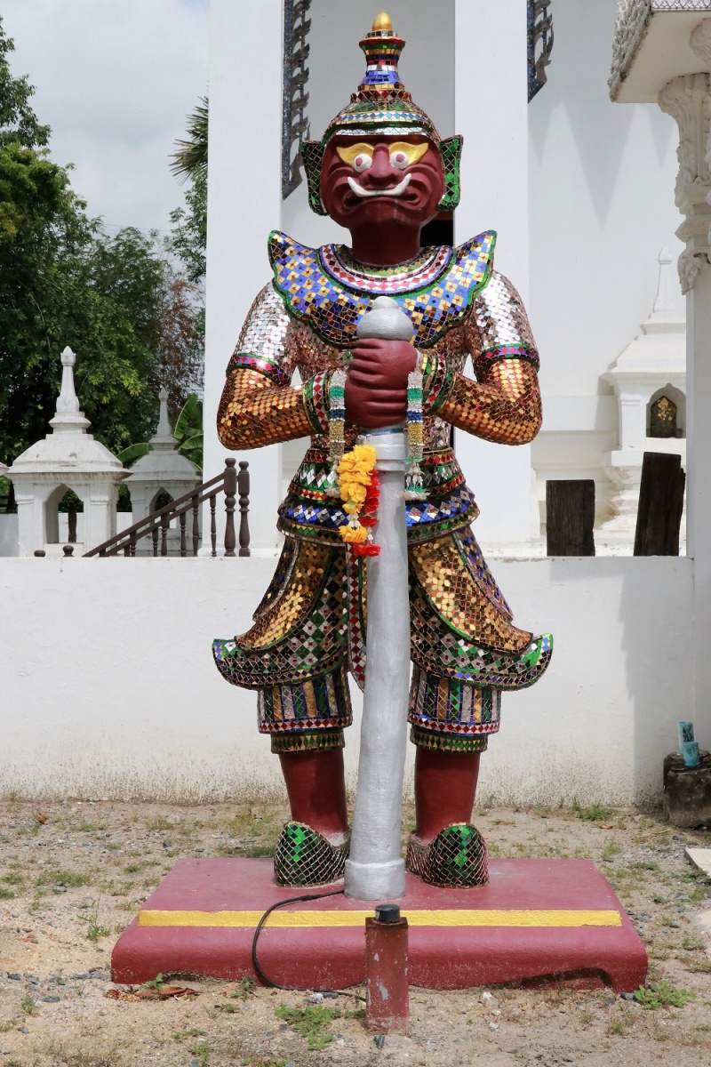 ช่อฟ้า ใบระกาและหางหงส์ปูนปั้นประดับกระจก หน้าบันไม้ประดับกระจกสีมีสาหร่ายรวงผึ้งประดับ ด้านหน้าแบ่งออกเป็น ๓ ช่วง คือ ช่วงบนเป็นไม้ฉลุลายประดับกระจกสีน้ำเงินเป็นรูปพระนารายณ์ ประทับยืนอยู่บนมือของหนุมาน ด้านข้างเป็นดอกไม้และก้านใบไม้คดโค้ง ช่วงกลางของหน้าบันเป็นภาพ ดอกไม้มียักษ์ ๒ ตน ถืออาวุธเหาะอยู่ทางด้านข้างประดับด้วยลายใบไม้ และก้านใบไม้คดโค้ง หน้าบันช่วงล่างเป็นภาพยักษ์ ๔ ตอน มีลายใบไม้และก้านใบไม้คดโค้ง หน้าบันด้านหลังพระอุโบสถมีรูปแบบคล้ายคลึงกัน ช่วงบนเป็นรูปเทวดาประทับนั่งอยู่บนแท่นฐานสิงห์มีชายผ้าทิพย์ห้อยประดับด้วยลายก้านขด ช่วงกลางของหน้าบันเป็นรูปหน้ากาฬ มีเทวดาและนางอัปสรประทับยืนอยู่ทางด้านข้าประดับด้วยลายก้านขด ช่วงล่างเป็นรูปเทวดา นางอัปสร และยักษ์นั่งพนมมือแสดงความเคารพ ด้านข้างมีลายก้านขดประดับ