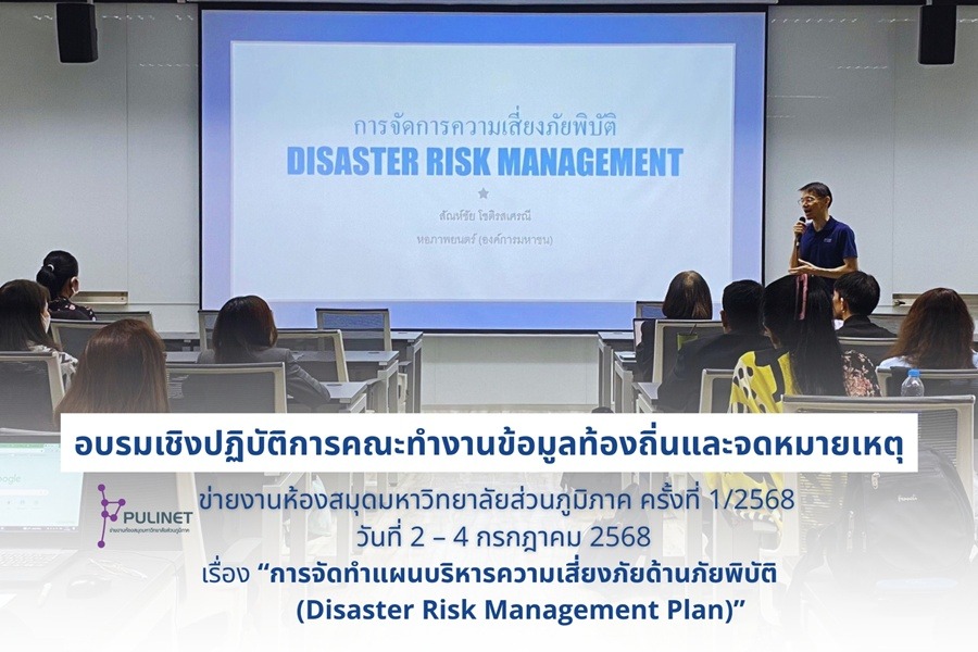 สำนักบรรณสารสนเทศ ร่วมกับ คณะทำงานข้อมูลท้องถิ่นและจดหมายเหตุ ข่ายงานห้องสมุดมหาวิทยาลัยส่วนภูมิภาค (PULINET) จัดอบรมเชิงปฏิบัติการเรื่อง “การจัดทำแผนบริหารความเสี่ยงภัยด้านภัยพิบัติ (Disaster Risk Management Plan)” ให้กับคณะทำงานข้อมูลท้องถิ่นและจดหมายเหตุ จำนวน ๒๓ คน